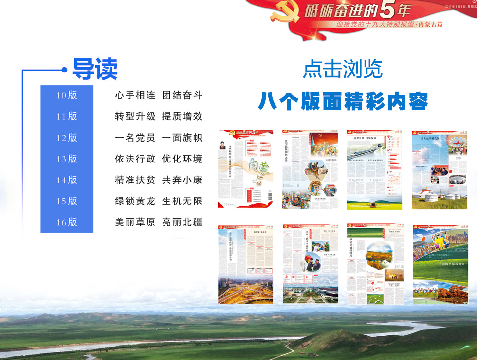 版面目錄1947年5月1日,中國共產黨領導的第一個民族區域自治地區——內蒙古自治區在烏蘭浩特正式成立。70年后,一個繁榮昌盛、生機勃勃的現代化內蒙古屹立于祖國的北部。