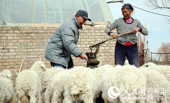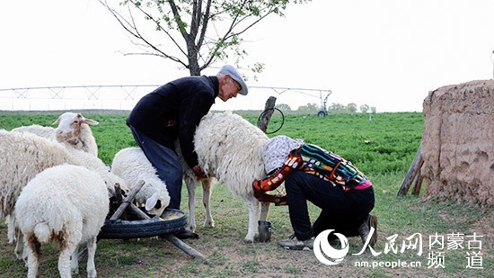 老人與妻子斯琴其木格在給羊打水。(受訪對象供圖)