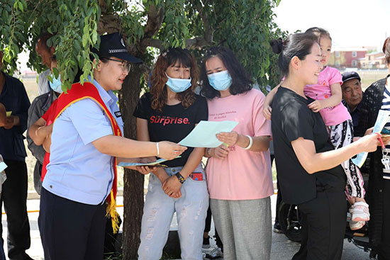 七月的草原上,早晨的太陽紅的似火,灼的人臉生疼,烏蘭牧騎隊員的演出還沒開始,這里就圍觀了好多人,就連在樹下乘涼的大爺大媽們也都湊了過來,好不熱鬧。走近才知道,原來是宣傳服務隊在給孩子們講解識毒防毒知識呢,烏蘭牧騎隊員作為義務宣傳員和民警們一同用蒙漢雙語向群眾們宣傳講解著《民法典》、電信詐騙、網絡安全、掃黑除惡等法律知識和安全防范常識。