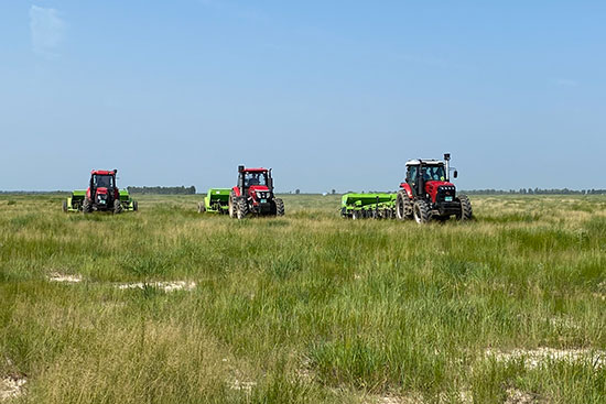 踏上科左中旗勝利鄉額木勒吐嘎查的草原,三臺免耕機正在補播牧草,十分忙碌。“科左中旗現在采用的是免耕補播的方式,這種方式不會破壞草原上原有的植物。”該旗草原工作站副站長高明華一邊帶領筆者往草原深處走去,一邊介紹此次播種的優點:“這次播種了四樣多年生的優質草籽,即紫花苜蓿、草木犀、堿茅和披堿草,都是適合鹽堿地、沙地的品種,符合我們左中的土質和氣候。目前的政策是全年禁牧,這樣的補播方式和播種草籽十分有利于修復退化的草原。”當前科左中旗草原上的草都是當年生種類,靠種子成熟后第二年生長,如果趕上大災年種子無法成熟則會加重草原退化;補播的多年生的優質牧草則保證了生態環境的良好態勢,有效緩解草原退化。