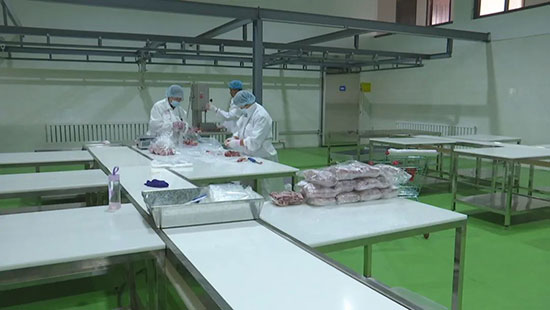 今年,烏審旗針對以往不同部門在消費扶貧中各自為戰、用力分散的問題,組建了旗屬國有農牧業開發有限公司,統籌調配整合全旗優質農畜產品進行收集、分級、包裝、檢測、配送、銷售,為農牧民提供產前、產中、產后一條龍服務。烏審旗蒙源天牧加工廠就是公司下屬的牛羊肉深加工企業,加工廠設計年生產加工規模為40萬只細毛羊和10萬頭本地紅牛,采取“公司+訂單+農牧戶”的模式,與農牧戶結成利益聯結共同體,助推全旗扶貧產業發展壯大。