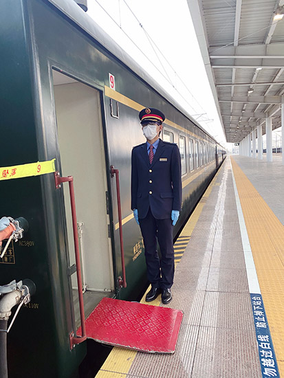 k574次列車員魏明璐首發(fā)立崗作業(yè)。