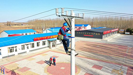 國家電網蒙東電力共產黨員服務隊隊員對常勝村扶貧車間米面加工廠供電線路設備進行消缺。