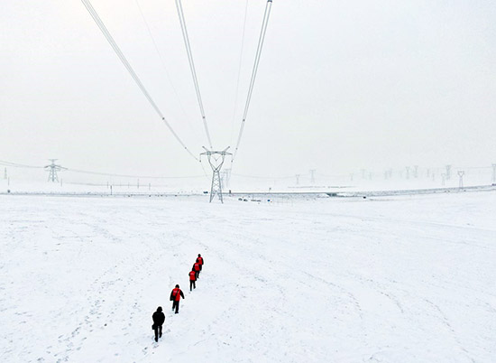 2月3日,清晨的陽光灑向銀裝素裹的錫林郭勒大草原,立春已到,本該回暖的天氣卻不見升溫,新一輪的寒流侵襲著茫茫曠野,氣溫始終維持在零下28度左右。在一望無際的雪地上,一抹紅色點綴著冰雪世界,顯得格外耀眼。這是國網蒙東電力共產黨員服務隊隊員項羽和董帥正在巡視內蒙古特高壓電力外送通道——錫盟——泰州±800千伏特高壓直流輸電線路。