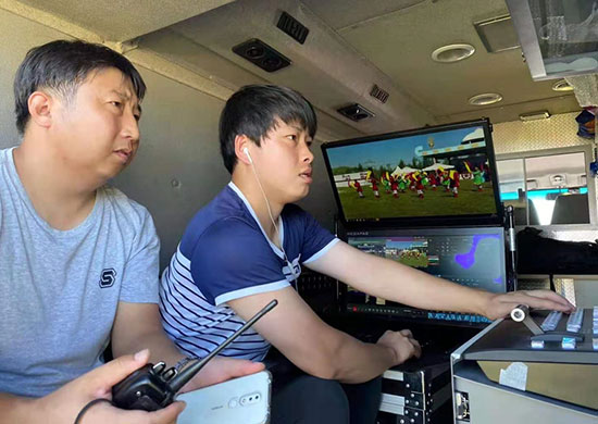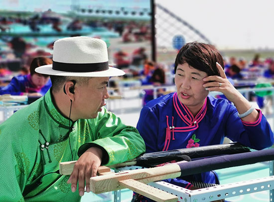 興安廣播電視臺工作人員在第三屆蒙古族傳統弓射箭大賽現場進行直播