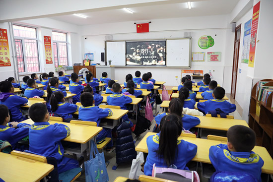 新城區(qū)滿族小學(xué)學(xué)生在紅紐扣課堂上觀看黨史教育專題片,重溫黨的奮斗歷程。