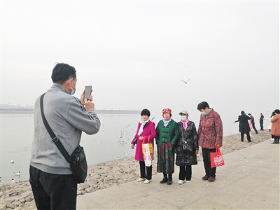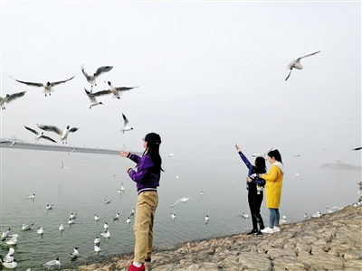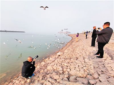 烏海湖位于烏海市海渤灣區、烏達區及阿拉善盟阿拉善左旗交界處。一大早,烏海湖一號碼頭已是一幅熱鬧景象,成百上千的紅嘴鷗等候鳥已經飛到了這里,感受著烏海這座大漠湖城的春光無限。在岸邊,市民游客爭相與這些可愛的網紅拍照,這樣和諧的人鳥互動場景,已連續4年在烏海上演。烏海已成為紅嘴鷗春季遷徙途中停留休整的重要驛站。