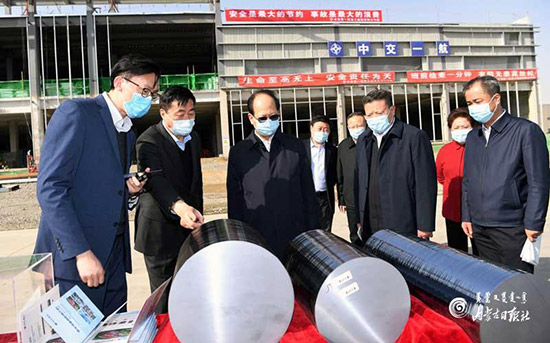 3月23日,自治區黨委書記、人大常委會主任石泰峰來到內蒙古光威碳纖有限公司,了解大絲束碳纖維產業化項目建設情況。 內蒙古日報社融媒體記者 袁永紅 攝