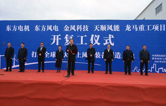 4月22日,科爾沁區在龍馬集團高端裝備制造產業園舉行東方電機、東方風電、金風科技、天順風能、龍馬重工項目開復工儀式。通遼市委副書記、政法委書記、科爾沁區委書記杜匯良出席儀式并致辭,市區領導郭建偉、朱瑞蓮、烏力吉、彭立軍、齊志軍、王百濤、李守信、趙喜忠、楊宇奇、楊秀媛等出席。儀式由科爾沁區委副書記、政府區長于會濤主持。