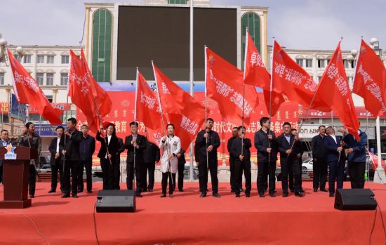 全市黨史學習教育“我為群眾辦實事——我幫你”新時代文明實踐志愿服務集中行動儀式上,為旗縣志愿服務隊授旗。記者 王俊平 攝