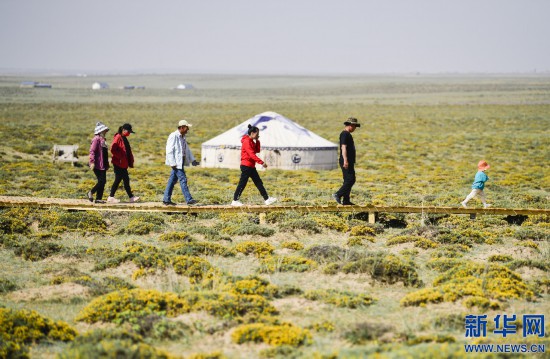 5月13日,游客在鄂爾多斯市鄂托克前旗上海廟鎮芒哈圖嘎查藏錦雞兒花田里游覽。新華網發 (王正攝)