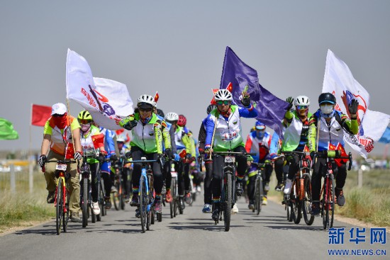 5月13日,自行車運動愛好者在鄂爾多斯市鄂托克前旗上海廟鎮芒哈圖嘎查藏錦雞兒保護區參加騎行旅游大賽。新華網發( 王正攝)