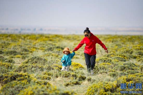 5月13日,一對母子在鄂爾多斯市鄂托克前旗上海廟鎮芒哈圖嘎查藏錦雞兒花田里嬉戲。新華網發 (王正攝)