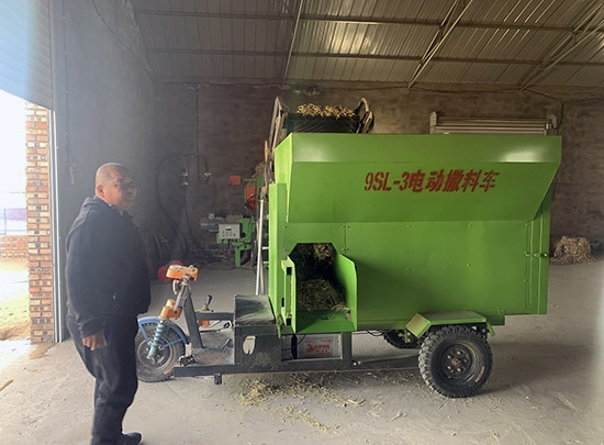 圖為牧民額定烏拉正在為電動撒料車備料。記者 張棖攝
