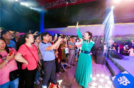 臺上,穿著蒙古長袍,戴著尖頂氈帽的演員放聲歌唱;臺下,套著背心短褲,屐著涼拖的觀眾翹首欣賞。34℃的高溫下,來自內蒙古鄂爾多斯烏審旗烏蘭牧騎的姑娘小伙們就這樣與福建省福州市的市民、游客相遇了。