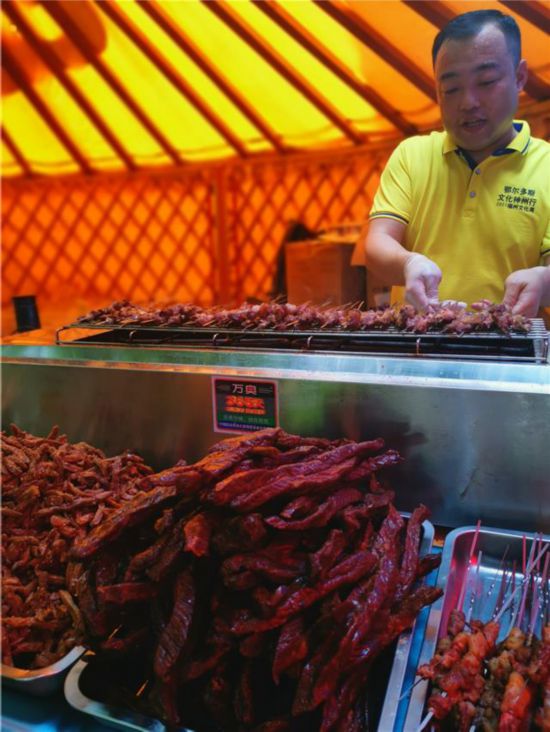 舞臺上演員載歌載舞,舞臺下展商努力吆喝。這次神州行除了烏蘭牧騎,還來了12家鄂爾多斯當地的文創類、服裝類、餐飲類小微企業。湖南人肖彬就是其中之一。