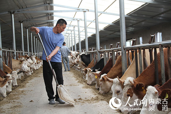 寬敞整潔的牛舍里,李強正給牛喂食。人民網(wǎng) 張聿修攝