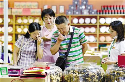 7月2日,消費者在茶博會上選購陳皮茶。當日,為期4天的2021第九屆中國(呼和浩特)茶產業博覽會在內蒙古國際會展中心開幕。據了解,本屆茶博會的主題為“茶茗草原·客迎八方”,展覽面積達20000平方米。展會云集六大茶類、精品茶具、陶瓷紅木、茶工藝品、茶服等,匯聚10多個展團和400余家茶企。記者 王磊 攝