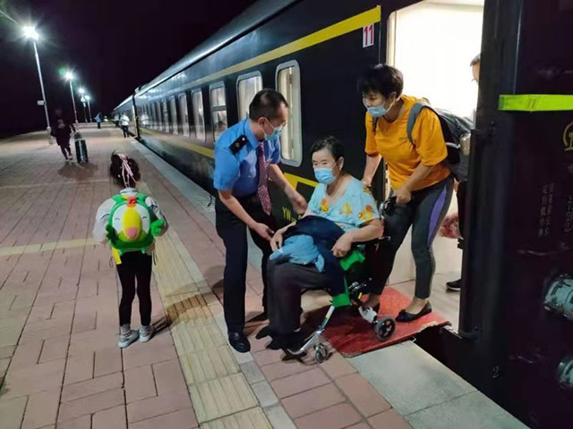 乘務(wù)員幫助行動(dòng)不便的旅客下車(chē)