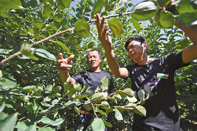 呼和浩特市科技特派員(右)指導果農種植技術。