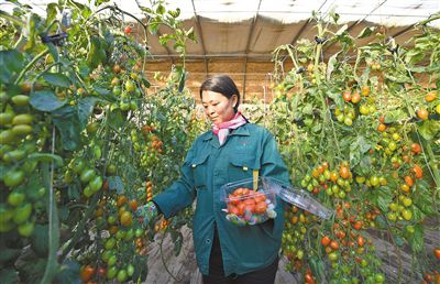 興安盟突泉縣曙光現代農業循環經濟園區聚美恒果四季采摘園內,工作人員正在采摘。
