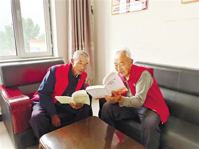 賈富強(qiáng)(左一)和劉占喜兩位老人在一起學(xué)黨史。 記者 劉向平 攝