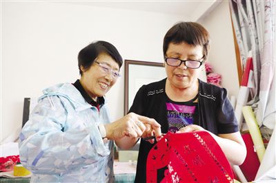 高學(xué)華(左)和學(xué)員交流剪紙技巧。