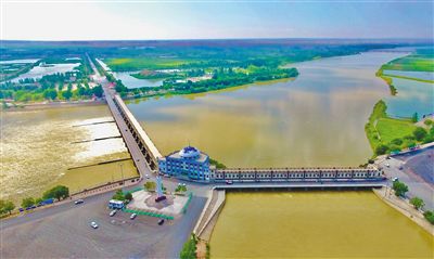 黃河三盛公水利樞紐夏日航拍圖。黃河三盛公水利樞紐是黃河上唯一以灌溉為主的一首制大型引水平原閘壩工程。這項工程徹底結束了河套灌區“天旱引水難,水大流滿灘”的歷史,保障了河套平原的豐饒。記者 孟和朝魯 攝