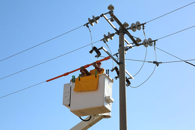 在包和平交代完工作任務和安全事項后,大家開始裝設安全柵欄、對帶電工器具進行絕緣試驗。帶電作業班成員劉志勇迅速爬上絕緣斗臂車車斗,穿上絕緣服,熟練地操作帶電作業車,向作業點靠近。半空中,劉志勇操作著車斗在導線間穿梭,在作業面導線兩端安裝上紅色的絕緣遮蔽罩,用電動扳手擰開螺絲,解開帶電引線的一瞬間,“滋滋”的電流聲,在熱浪中格外刺耳,著實讓人緊捏一把汗。30分鐘后,劉志勇重回地面,脫下絕緣服,他的胳膊和手被汗水悶得發白,豆大的汗珠從臉上落下,整個人像被水洗過一樣。