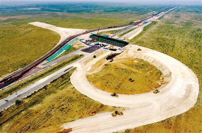 8月13日,施工機械在二廣高速公路二連浩特至賽漢塔拉段建設齊哈日格圖互通立交橋(無人機照片)。該路段是二(二連浩特)廣(廣州)高速公路建設中的最后一段,由內蒙古路橋集團承建,總投資25.77億元,全長99.5公里,預計2022年10月底全線通車。二廣高速公路途經內蒙古、山西、河南、湖北、湖南、廣東6省區,全長2685公里。王正 攝
