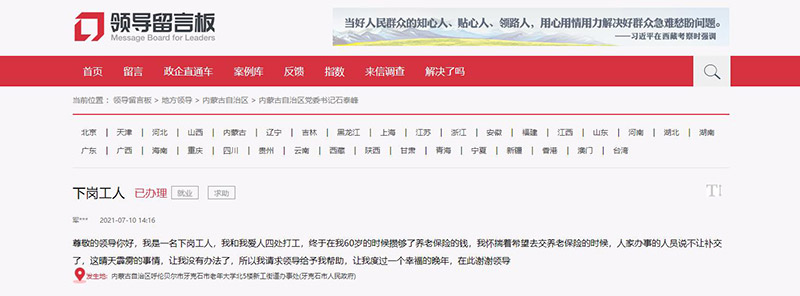 原來,這名網友在此前的留言中反映,自己是一名下崗工人,他和愛人一起四處打工,終于在60歲的時候攢夠了養老保險的錢,在去交養老保險的時候,辦事人員說不讓補交了,焦急的他如遭晴天霹靂,于是在領導留言板上留言尋求幫助。