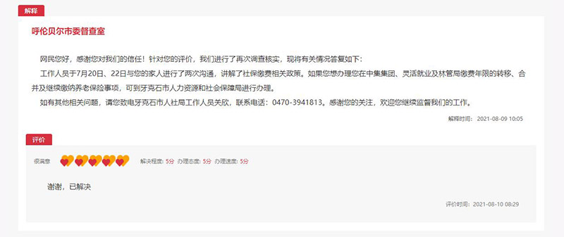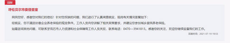 獲悉網友留言后,呼倫貝爾市委督查室高度重視,對有關情況進行了認真調查核實,并回復網友:“您不滿足補繳企業養老保險的規定條件。工作人員向您講解了相關政策要求,并建議您參加城鄉居民養老保險。”