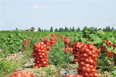 一個個裝滿洋蔥的紅色袋子成為了田野里一道獨(dú)特的風(fēng)景。