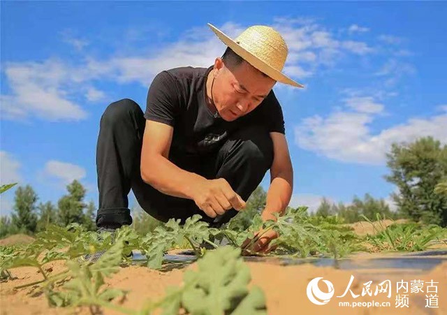 李海瑞正在地里查看瓜苗。李曉芳 攝