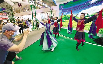 9月25日,鄂爾多斯市東勝區烏蘭牧騎隊員在第十七屆文博會上用極富“民族風”的歌舞實力圈粉。鄂爾多斯市應邀參展文博會,是內蒙古唯一參展的地級市。展位設計突出黃河文化,近120種鄂爾多斯文創旅游產品精彩亮相。記者 王磊 馮雪玉 攝