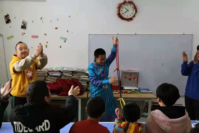 圖為2020年1月19日,內蒙古博物院志愿者團隊去呼和浩特市愛加倍星兒公益助殘中心,恩和來(中)為小朋友表演魔術。受訪者供圖