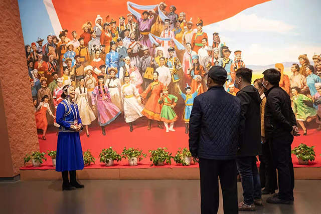 圖為2021年3月,邢海燕(左)在內蒙古博物院“草原豐碑”展廳進行講解。受訪者供圖