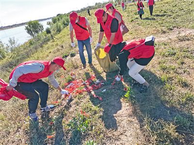 呼和浩特市水務(wù)局黨員志愿者清理垃圾。