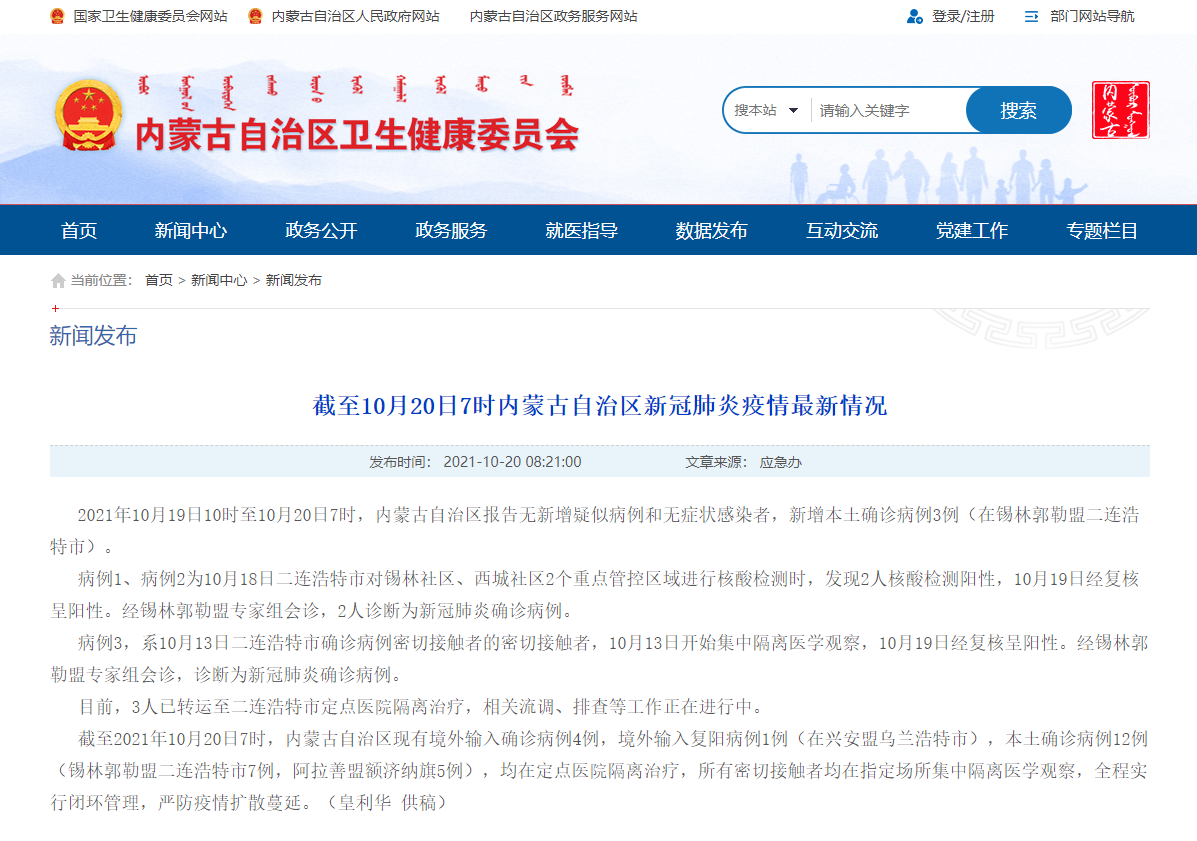 人民網呼和浩特10月20日電(趙夢月) 內蒙古自治區衛生健康委員會通報,2021年10月19日10時至10月20日7時,內蒙古自治區報告無新增疑似病例和無癥狀感染者,新增本土確診病例3例(在錫林郭勒盟二連浩特市)。