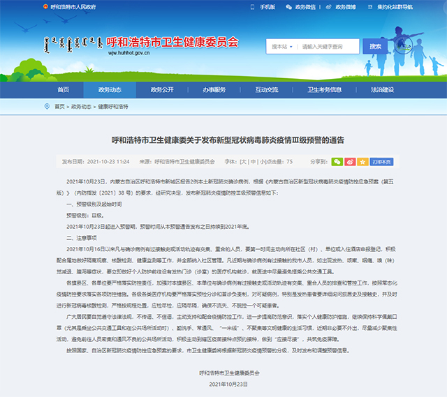 人民網呼和浩特10月23日電 (王慧)10月23日,呼和浩特市衛生健康委員會發布《呼和浩特市衛生健康委關于發布新型冠狀病毒肺炎疫情Ⅲ級預警的通告》。