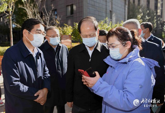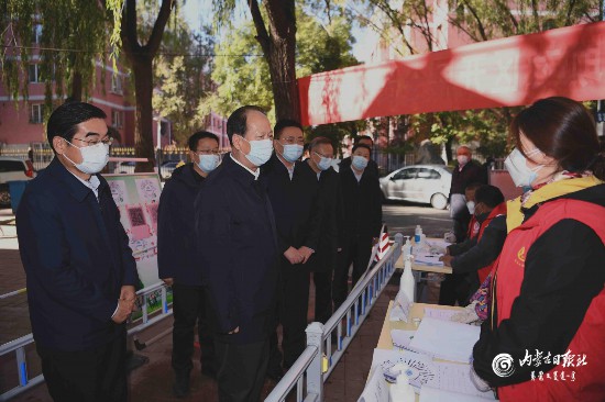 10月26日,自治區黨委書記、人大常委會主任石泰峰在呼和浩特市走訪大學西路街道學府花園路社區設置的臨時核酸檢測點,向工作人員了解運行情況。內蒙古日報社融媒體記者 袁永紅 攝