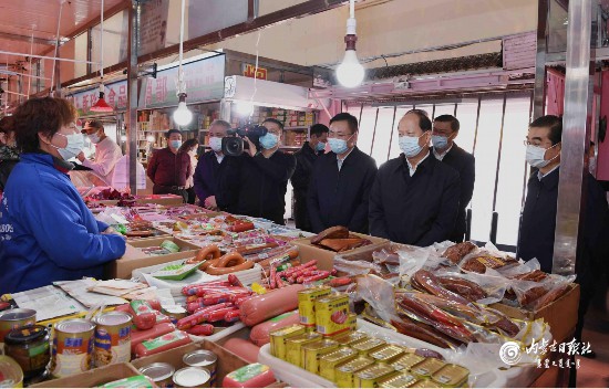 農貿批發市場承擔著群眾日常生活物資保障供應任務,同時也是疫情防控的重點部位。石泰峰來到東瓦窯農副產品批發市場,與購物市民一起接受體溫檢測。在水產海鮮和肉食大廳,他認真察看防控措施落實情況,“從哪里進的貨,產品有沒有進行檢疫?”他強調,農貿市場要嚴格按要求落實好索證索票和檢疫檢驗制度,凡是不能提供相關證明的,一律不能上市銷售,確保各類食品特別是冷鏈食品安全。發現有個別攤主口罩佩戴不規范,石泰峰提醒他們要科學佩戴、加強防護。