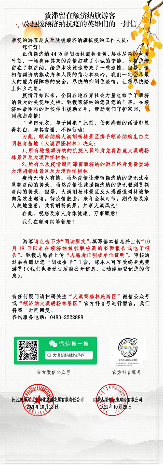人民網呼和浩特10月29日電 (王慧)10月29日,大漠胡楊林景區微信公眾號發布《致滯留額濟納旗游客及馳援額濟納抗疫英雄們的一封信》,信中說,疫情發生以來,全國各地各界社會力量也給予了額濟納最大的關愛和支持,馳援額濟納的您及您的同事,在額濟納最困難的時候伸出援助之手,額濟納旗大漠胡楊林景區攜手額濟納旗生態文明教育基地(大漠西怪樹林)決定,所有馳援額濟納的抗疫人員終身免費游覽大漠胡楊林景區及大漠西怪樹林,所有本次疫情期間滯留額濟納的游客終身免費重游大漠胡楊林景區及大漠西怪樹林。