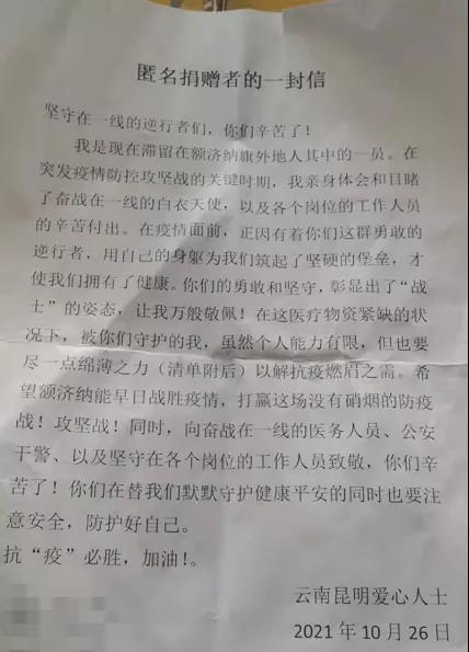 匿名捐贈者的信。額濟納旗融媒體中心供圖