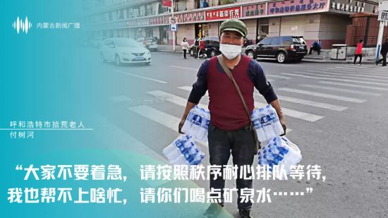 60歲老人付樹河滿頭大汗地將一瓶瓶礦泉水