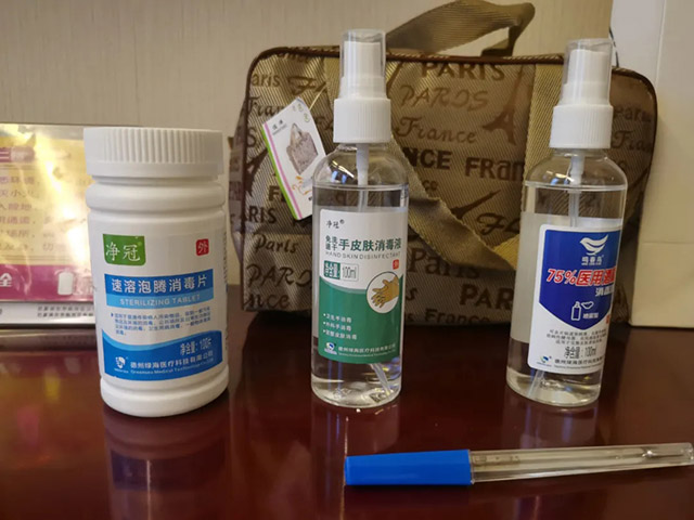 房間內還放有安全包,里面有免洗消毒液、體溫計、醫用垃圾袋等。每天產生的垃圾將按照醫用垃圾由工作人員統一處理。