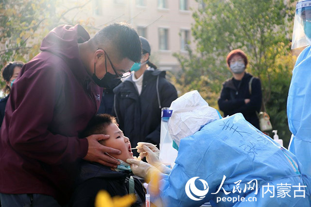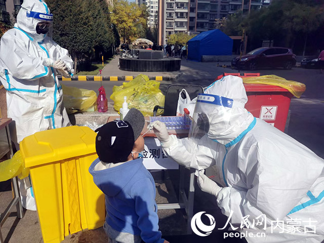 第二輪核酸開始后,呼和浩特市春雨社區檢測點,醫護人員正在為一位小朋友做核酸檢測。人民網 富麗娟攝