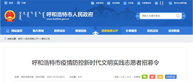 10月26日,呼和浩特市精神文明委員會辦公室、呼和浩特市志愿者聯合會共同發出“呼和浩特市疫情防控新時代文明實踐志愿者招募令”,號召廣大志愿服務組織、志愿者積極投身到疫情防控志愿服務中來。