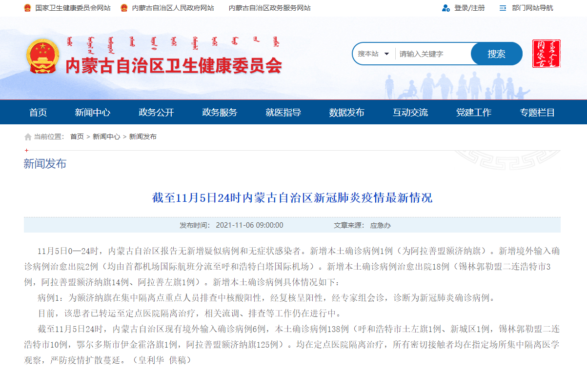 截至11月5日24時(shí),內(nèi)蒙古自治區(qū)現(xiàn)有境外輸入確診病例6例,本土確診病例138例(呼和浩特市土左旗1例、新城區(qū)1例,錫林郭勒盟二連浩特市10例,鄂爾多斯市伊金霍洛旗1例,阿拉善盟額濟(jì)納旗125例)。均在定點(diǎn)醫(yī)院隔離治療,所有密切接觸者均在指定場(chǎng)所集中隔離醫(yī)學(xué)觀察,嚴(yán)防疫情擴(kuò)散蔓延。
