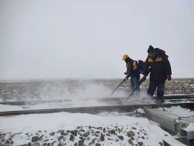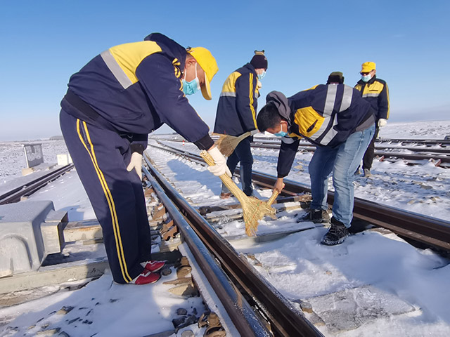 同樣以“雪”為令的還有負責臨河至策克鐵路運營維管的臨策維管段全體員工,由于該鐵路沿線80%的地段是沙漠邊緣地帶,惡劣的自然環境培養出了臨策維管人堅韌的品格,面對急來降雪,大家以嚴寒礪血性,以風雪鑄企魂,策克維修工隊出動19人、5臺除雪設備,蘇宏圖維修工隊出動49人、10臺除雪設備……一時間,6個工隊共計400余人迅速集結在各自管轄區間重點地段展開除冰掃雪作業,他們按照應急預案對區間、線路進行了集中檢查,并對道岔積雪及時進行處理。